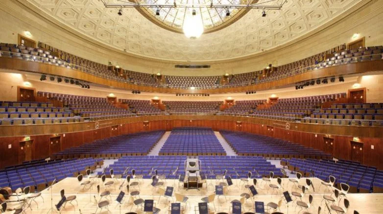 The Ballroom was originally a promenade and concert room but was enlarged and reconstructed in 1899. It is decorated in the exuberant, lavish style of the Paris Opera by Frank Matcham, executed by De Jong. This was restored in 1956 by Andrew Mazzei, after fire damage. Rising from the first floor level, the ballroom has galleries on two levels on the north, west and south sides, and a curved and moulded proscenium on the east. Mouldings and painted panels on the columns display the names of famous composers. The vaulted ceiling features Baroque paintings and an oval skylight.
